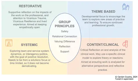 Group supervision tends to be provided on site at the workplace or online and are usually for 2 hours a session. Work will be undertaken with management and also the team to identify group supervision goals and also negotiate the most suitable model of group supervision. The focus can be clinical, educative, systemic or restorative.